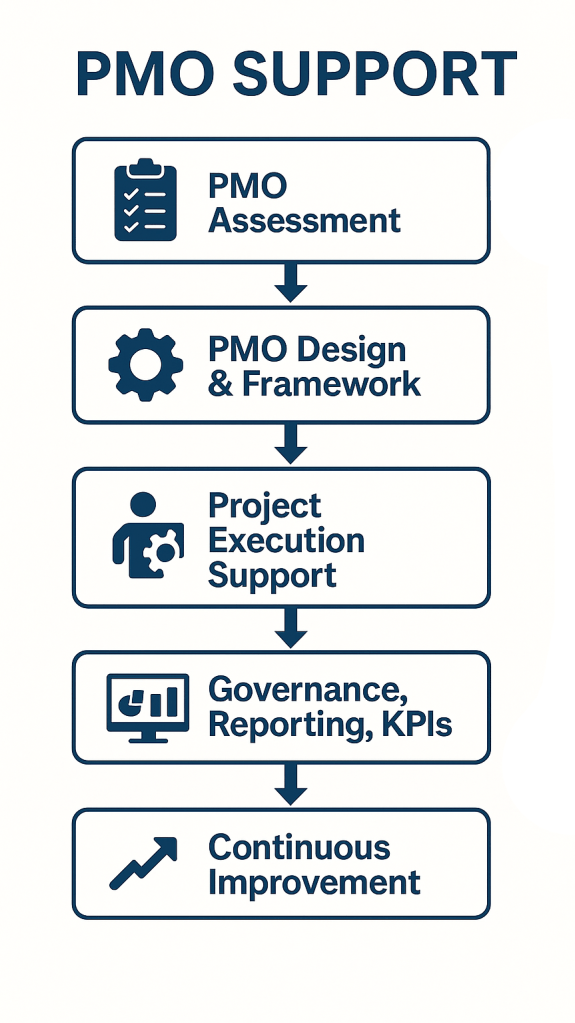 Our PMO Support services are designed to help you implement a high-functioning, scalable project management framework tailored to your organization’s unique needs. We provide hands-on expertise to assess your current capabilities, design custom governance structures, implement best practices, and establish real-time reporting tools that improve visibility and accountability. Whether you are looking to build a PMO from the ground up or optimize an existing structure, we offer the strategic guidance and operational support needed to elevate your project outcomes. Let’s work together to transform your project portfolio into a powerful engine for sustainable growth, execution excellence, and long-term success.